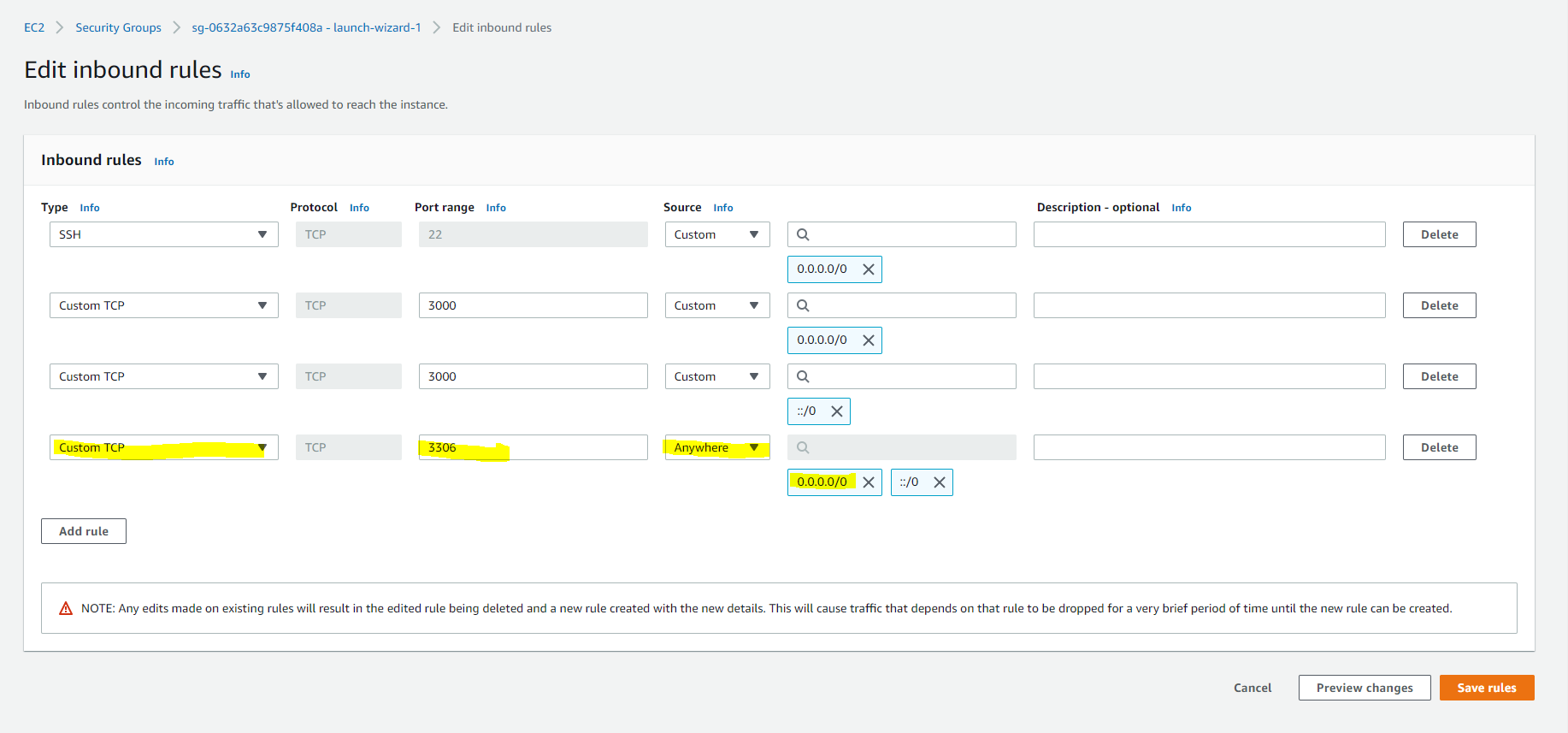 - 사용자 지정 인바운드 룰 적용 : Custom TCP > 3306 Port > 위치무관(Anywhere)