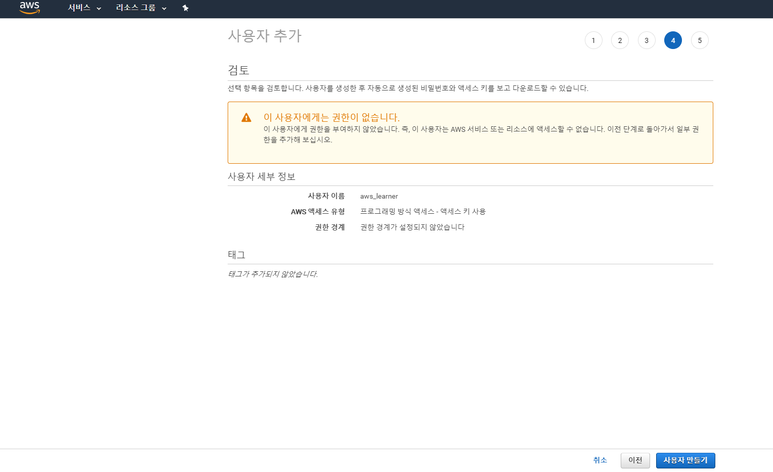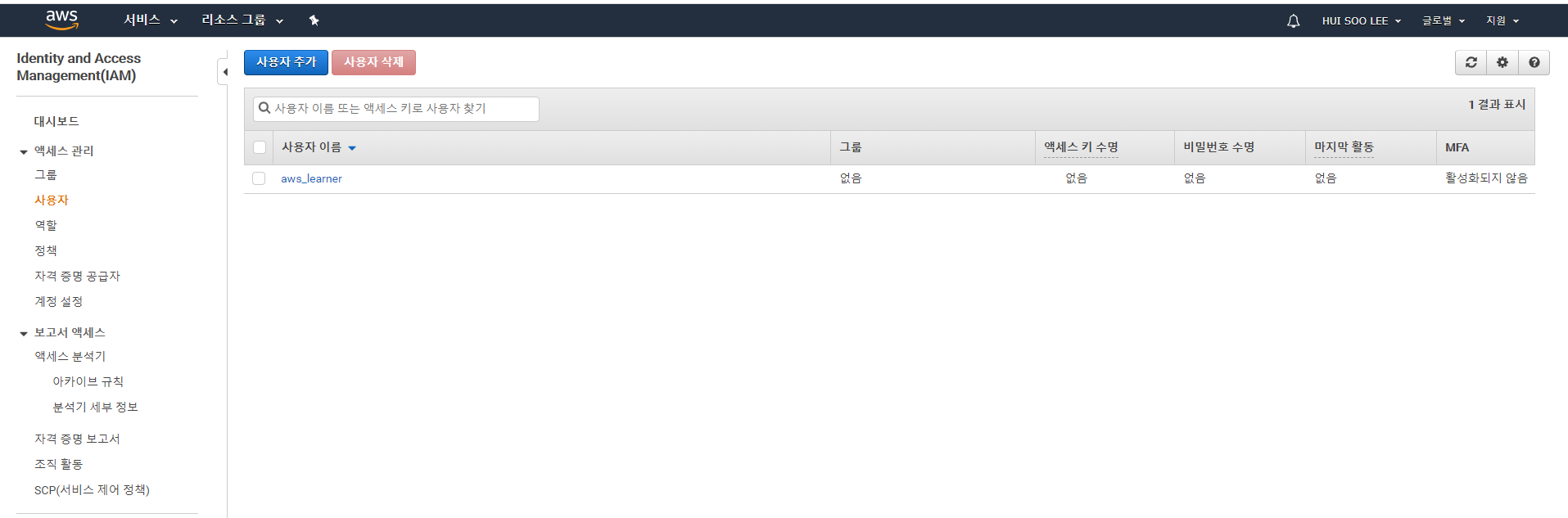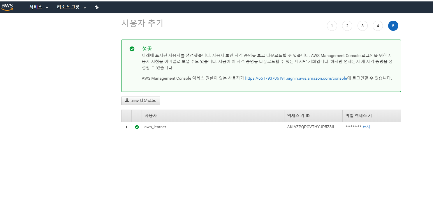 사용자 추가 완료 후 : 엑세스 키 ID와 비밀 엑세스 키 확인이 가능하다.