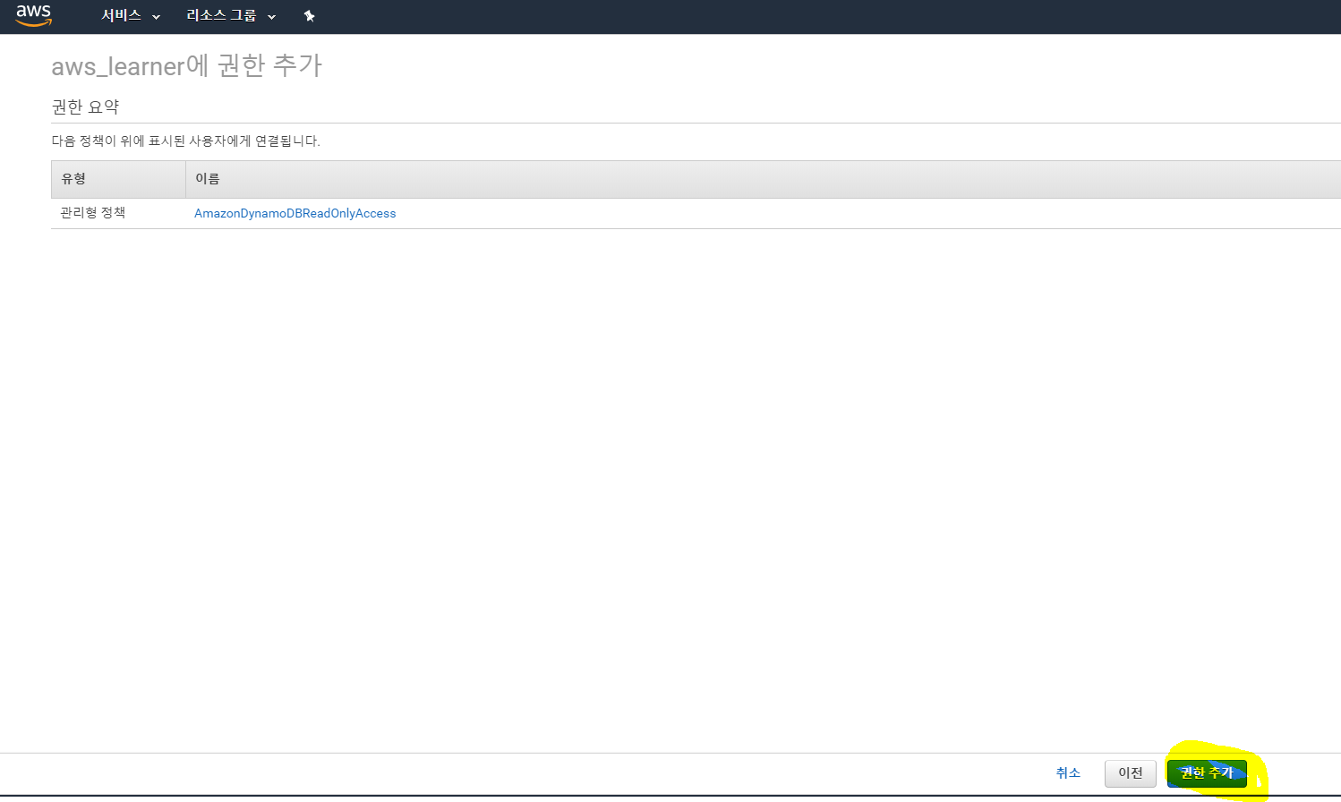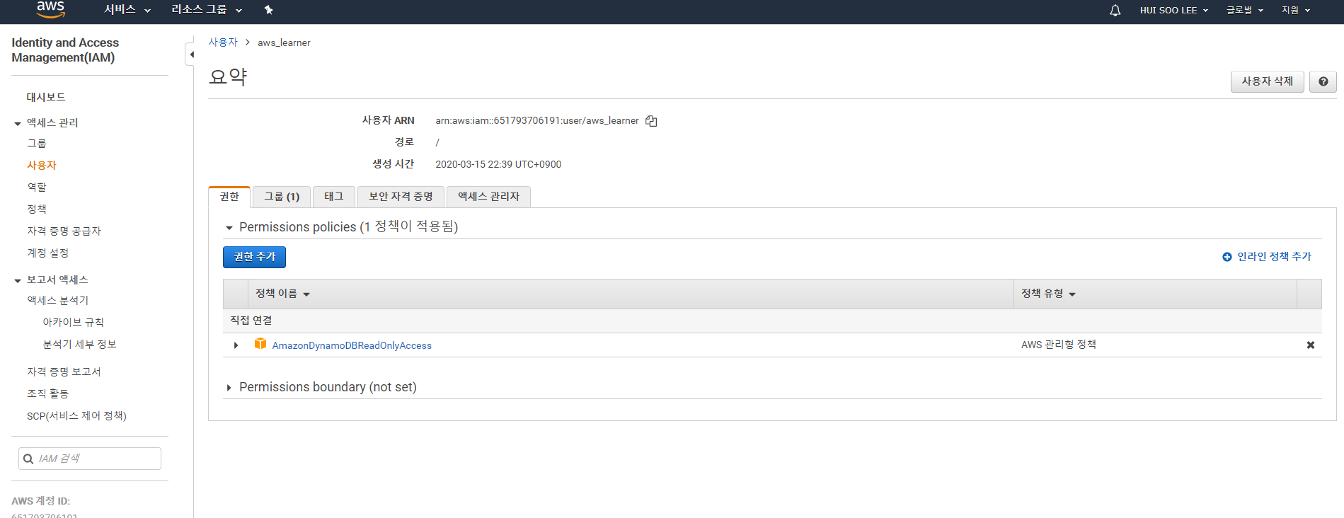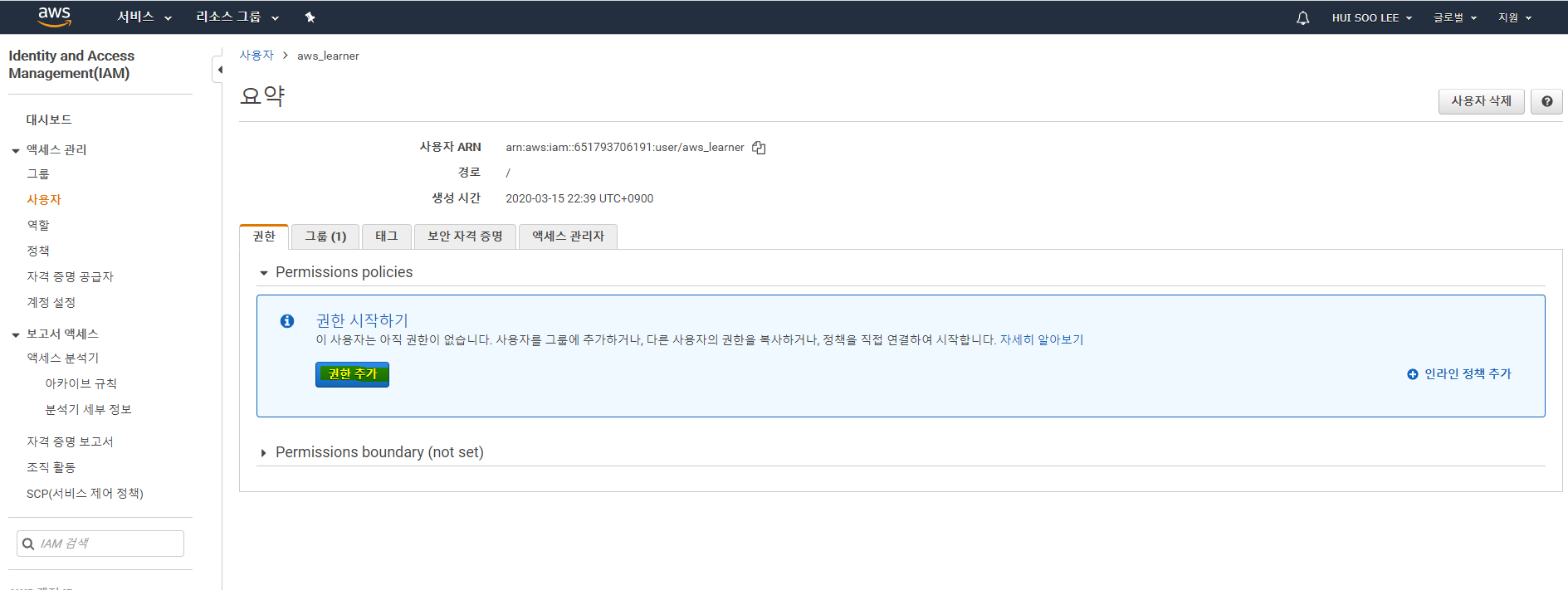 - aws_learner는 아무 권한도 없다.