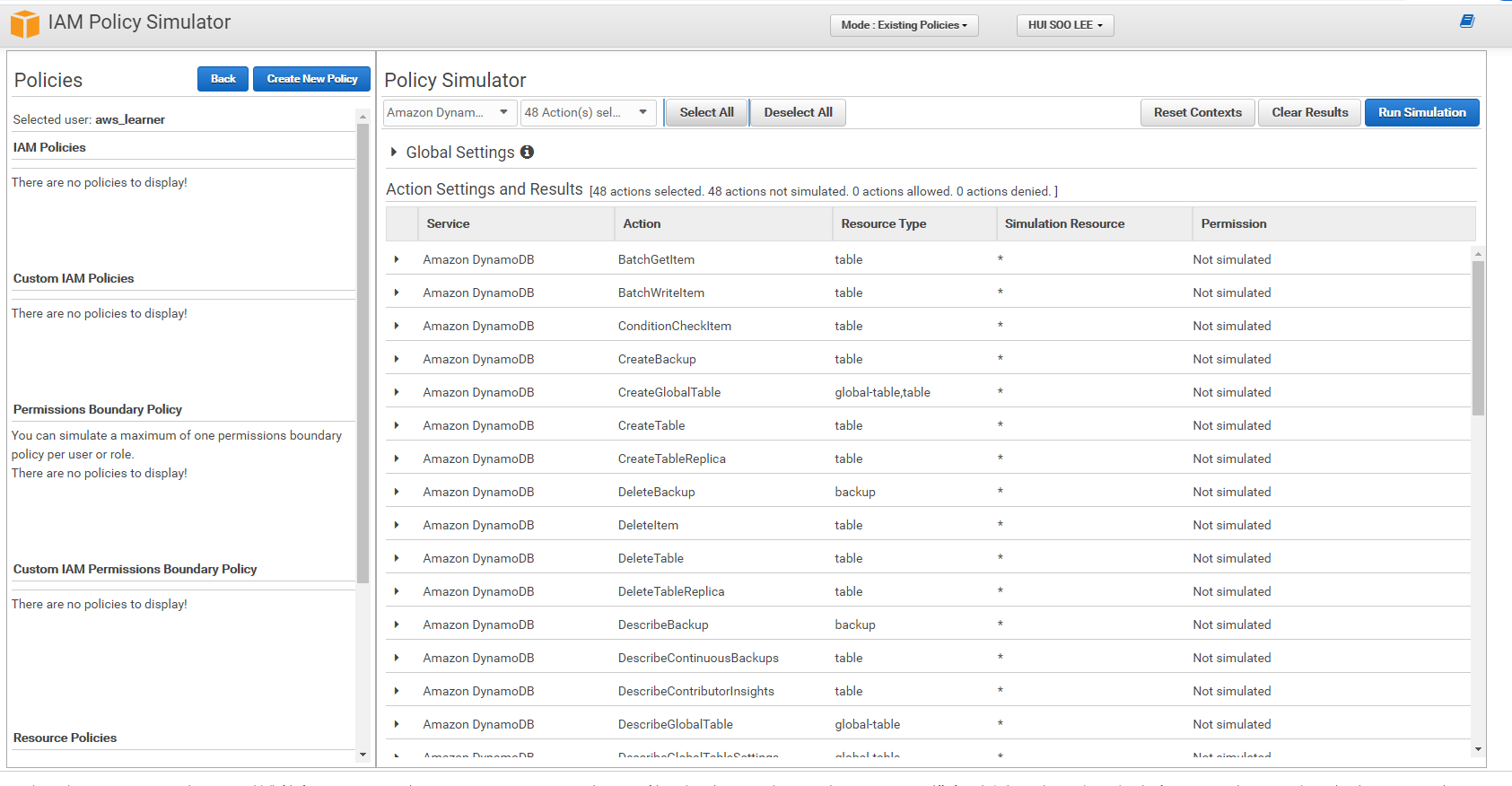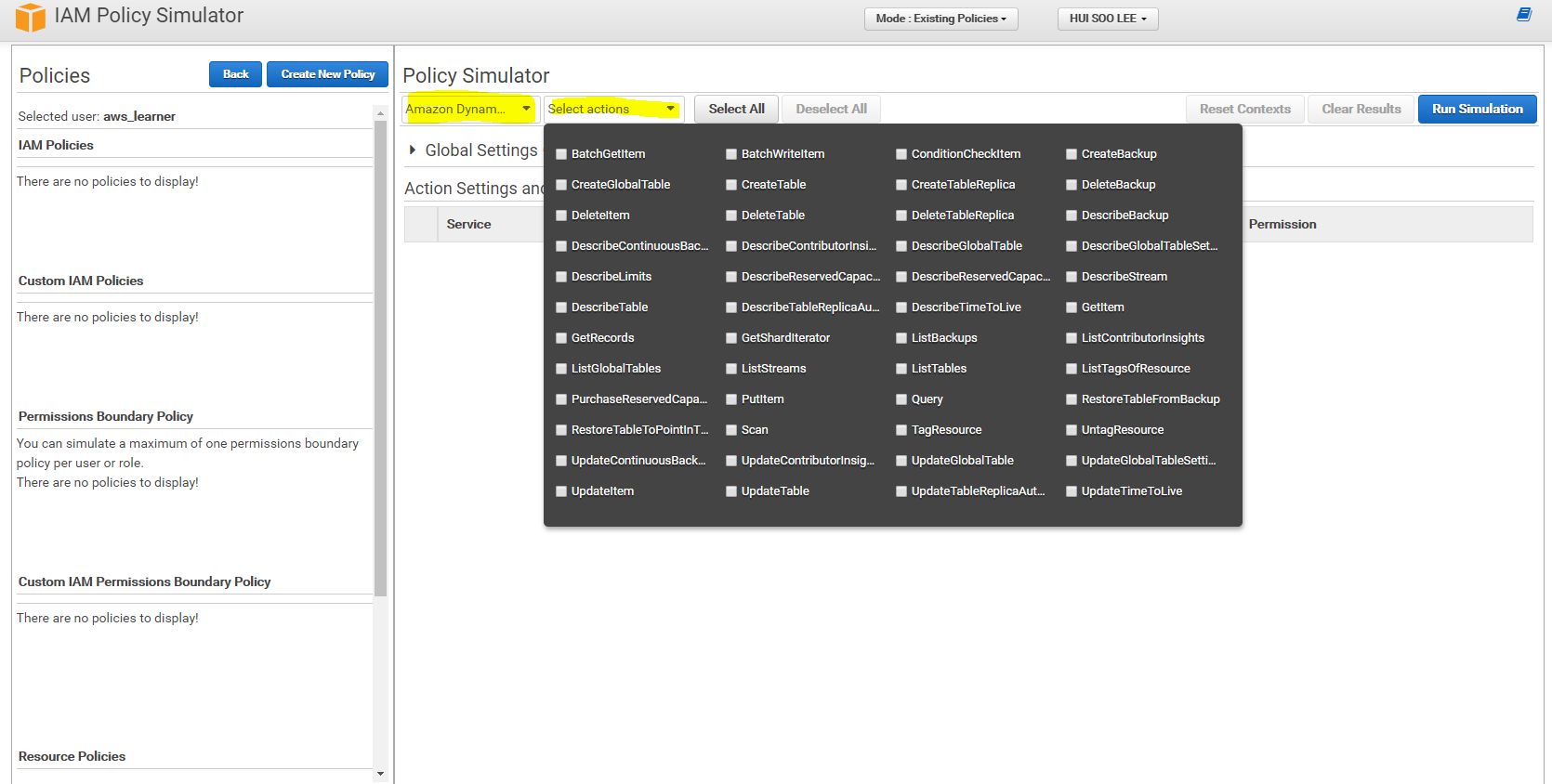 1) Policy Simulator에서 DynamoDB를 서비스로 선택하면 가능한 서비스 목록 확인이 가능하다.