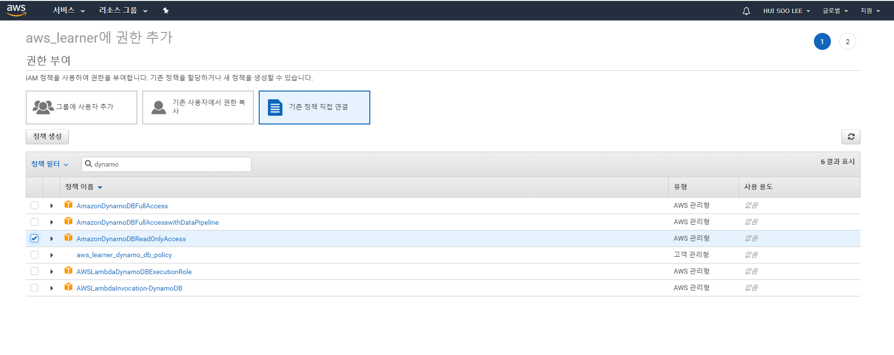 4) DynamoDB로 검색하여 AmazonDynamoDBReadOnlyAccess 체크박스 클릭 후 다음버튼 클릭