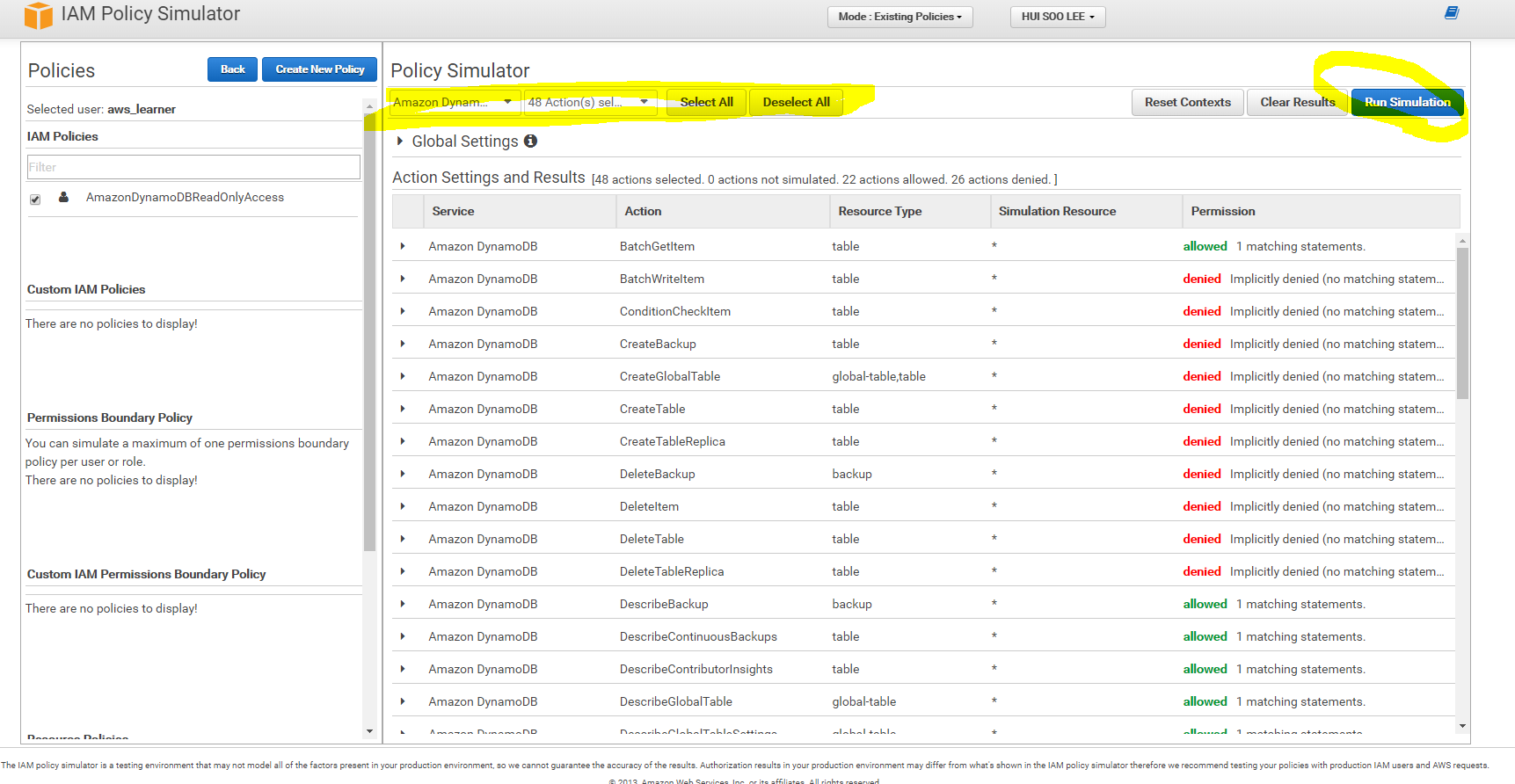 2) DynamoDB 서비스를 모두 선택 하고, Run Simulation 클릭