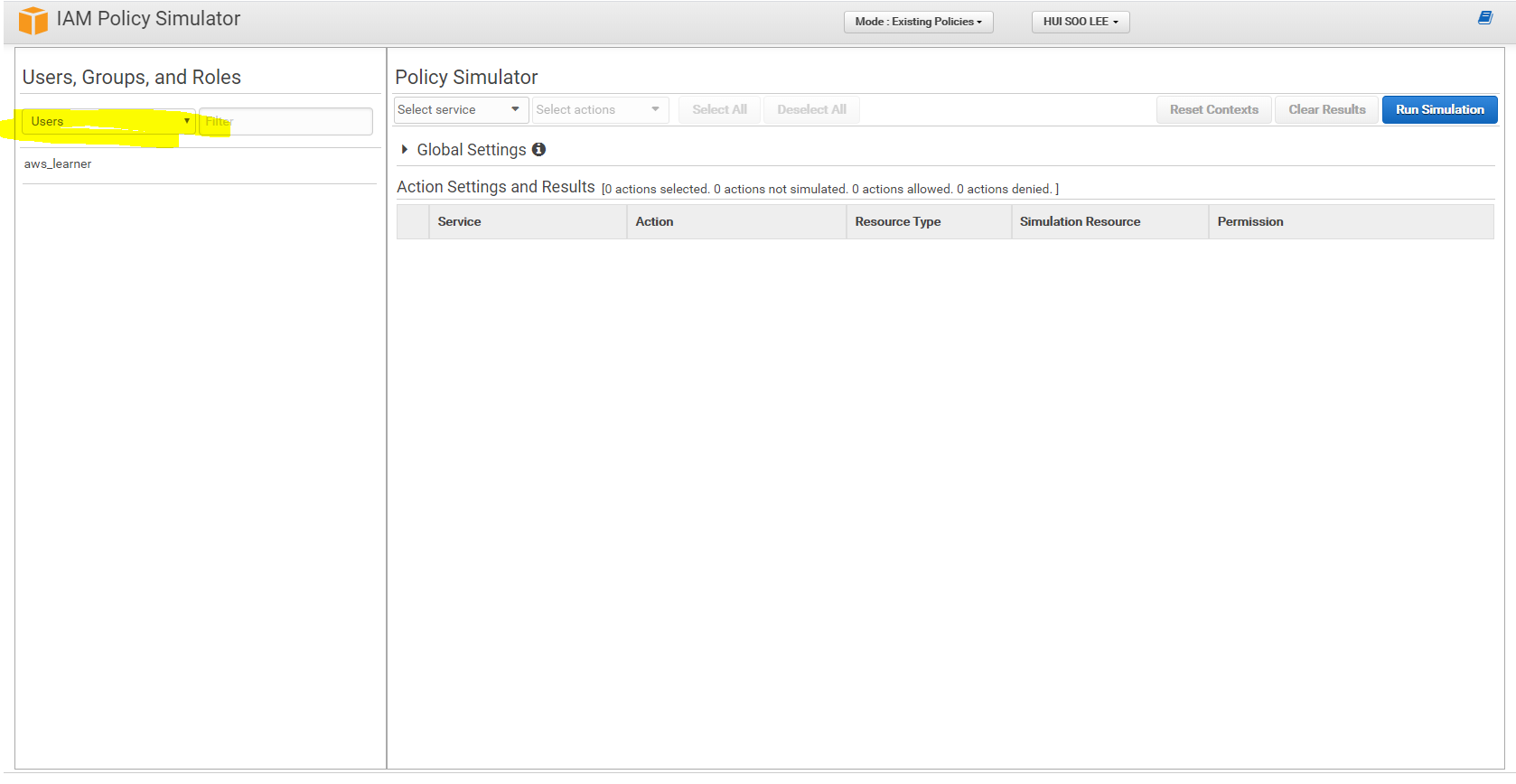 1) 정책 시뮬레이터에서 Users, Groups, Roles를 확인 할수 있다( 좌측 상단 셀렉트 박스)