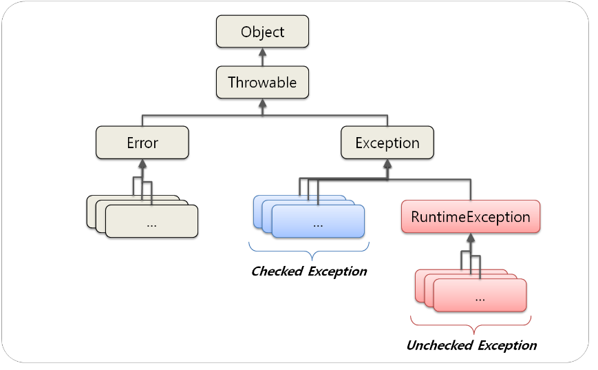 - Exception은 Checked Exception과 Unchecked Exception으로 구분됨