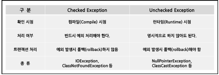- Exception은 Checked Exception과 Unchecked Exception으로 구분됨