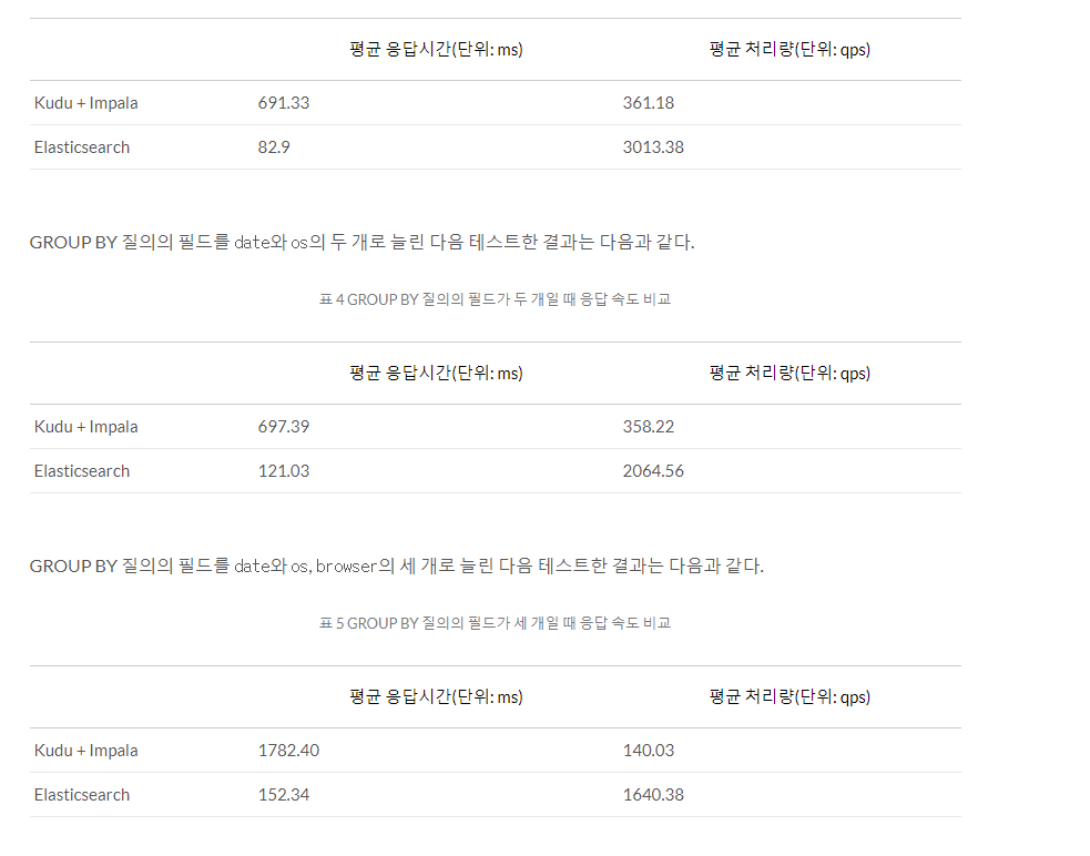 Impala는 분산 병렬 질의 처리 엔진이다. 다양한 스토리지를 연동해 사용자에게 친숙한 SQL로 질의할 수 있으며, 스토리지 엔진(storage engine)이 제공하지 않는 연산을 Impala를 통해 실행할 수도 있다. Impala가 제공하는 Kudu 질의 처리 기능을 테스트한 후 SQL을 통해 쉽게 데이터의 저장, 조회, 변경이 가능한 것을 확인했다. 다만 간단한 질의에도 메타 정보 확인, 실행 플랜 계획 등 스토리지에 적합하게 처리해야 하는 작업을 위한 시간 비용이 항상 포함되기 때문에 OLTP 성격 질의 처리에는 사용하기 어려웠다.