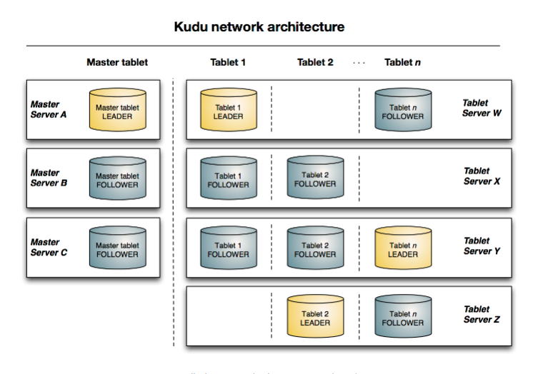 - Flexible Partitioning : Hive의 테이블 파티셔닝 개념과 유사하게 클러스터 전역에서 균등한 쓰기 및 쿼리 작업이 분산되도록 Kudu는 테이블을 해쉬나 범위기반으로 사전에 정의된 태블릿 개수만큼 동적으로 분활합니다.