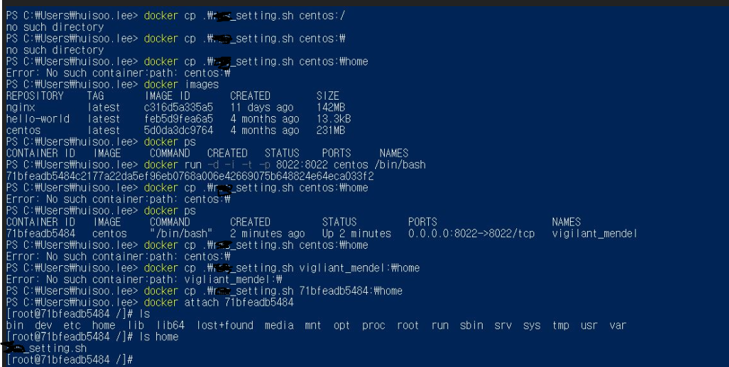 이를 도커 컨테이너에 centos 설치 후 환경셋팅 테스트를 진행하기로 방향을 잡았다.