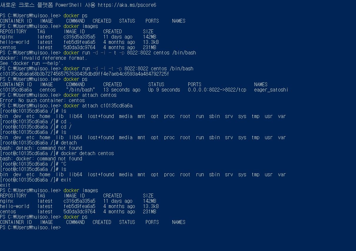 docker attach containerID ( centOS 접속 )