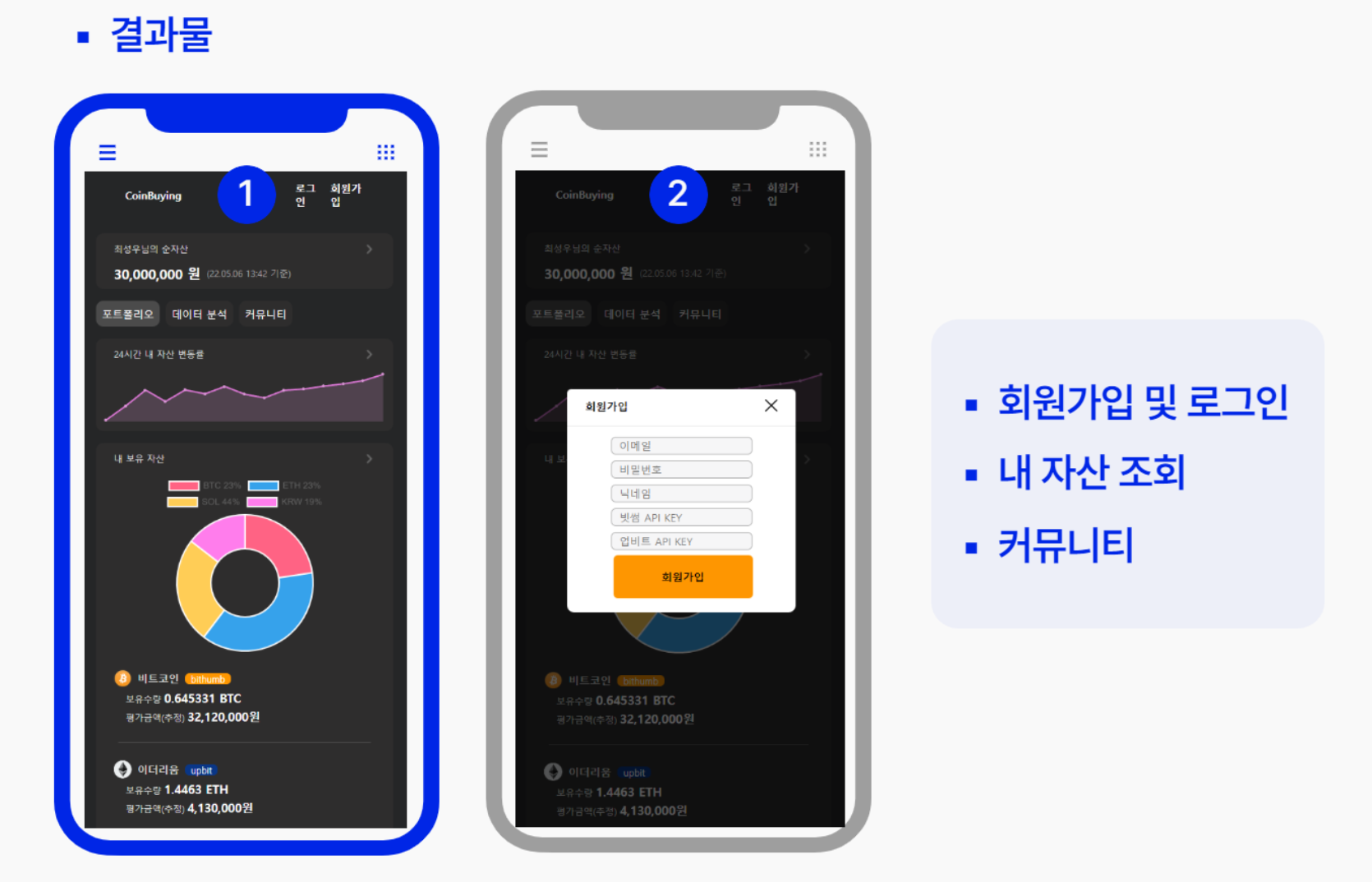 주제는 코인 자산 관리 시스템(~ 다양한 거래소의 코인을 모아서 보여주는 앱)을 간단하게 만들어보기로 했고