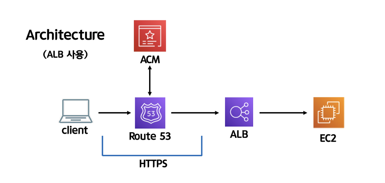 - client는 Route53에 등록된 도메인을 사용하여 ALB와 HTTPS 통신을 한다.